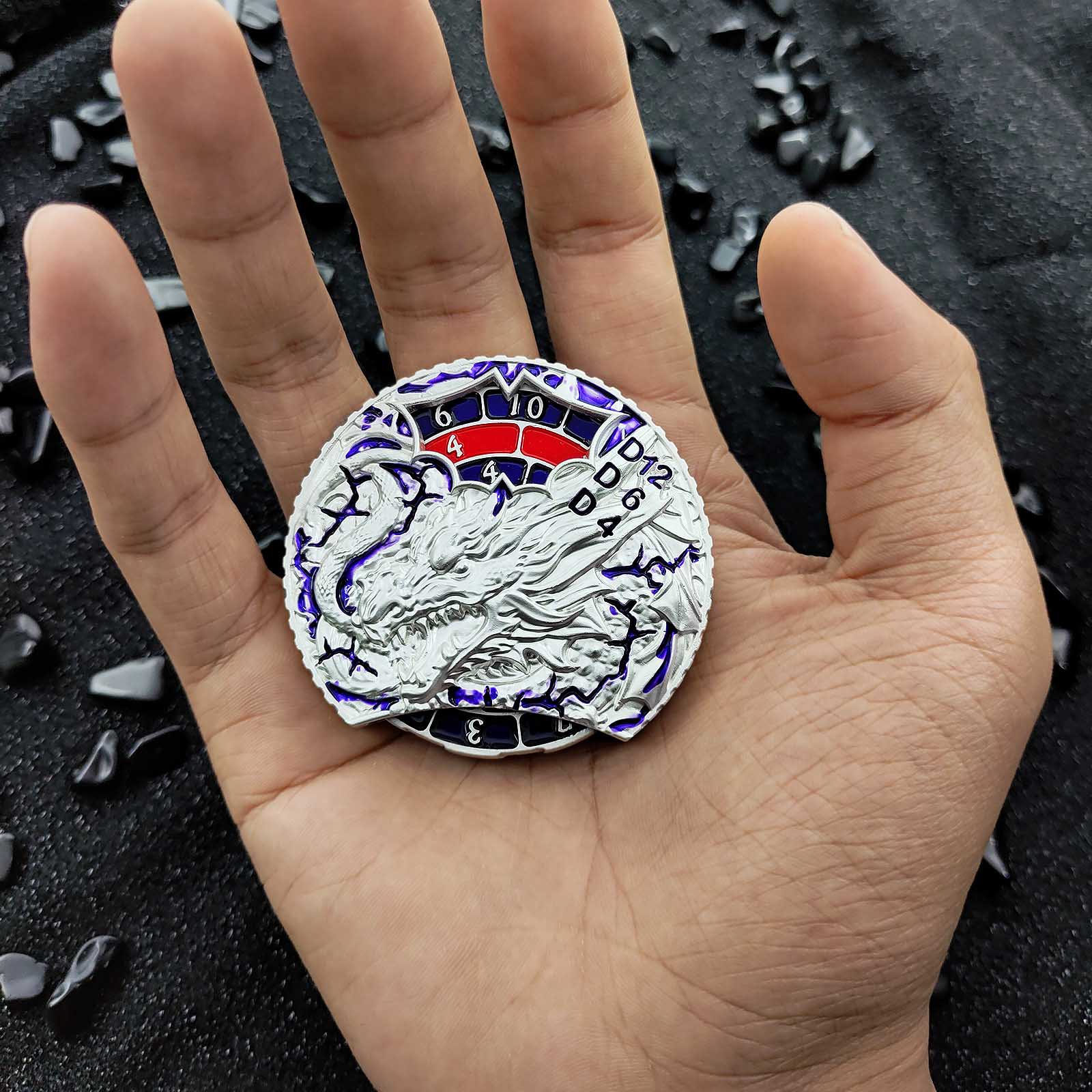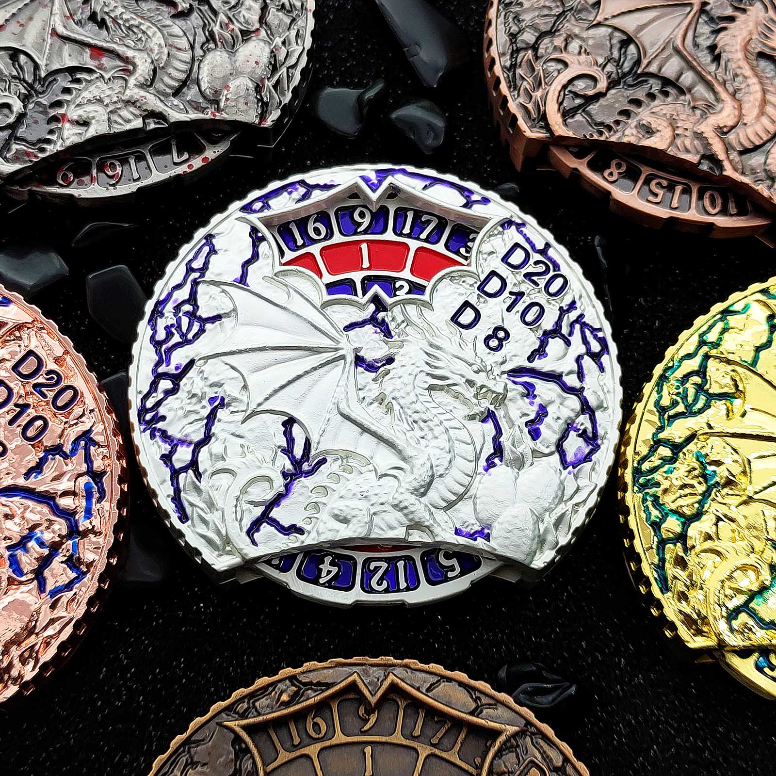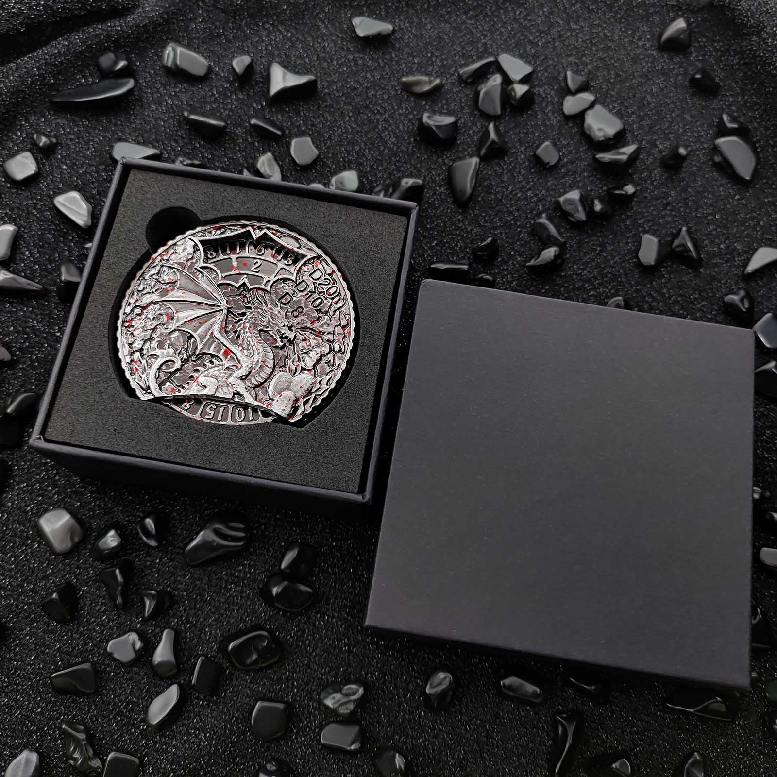 Ogni lato di questo spinner a doppia faccia è adornato con intricate incisioni di draghi, simbolo di potere e fantasia. Il lato anteriore include le funzioni per D20, D10 e D8, mentre il retro copre D12, D6 e D4. Con un semplice giro, puoi lanciare qualsiasi dado necessario per la tua campagna, rendendolo un'aggiunta pratica e accattivante alla tua collezione DnD.